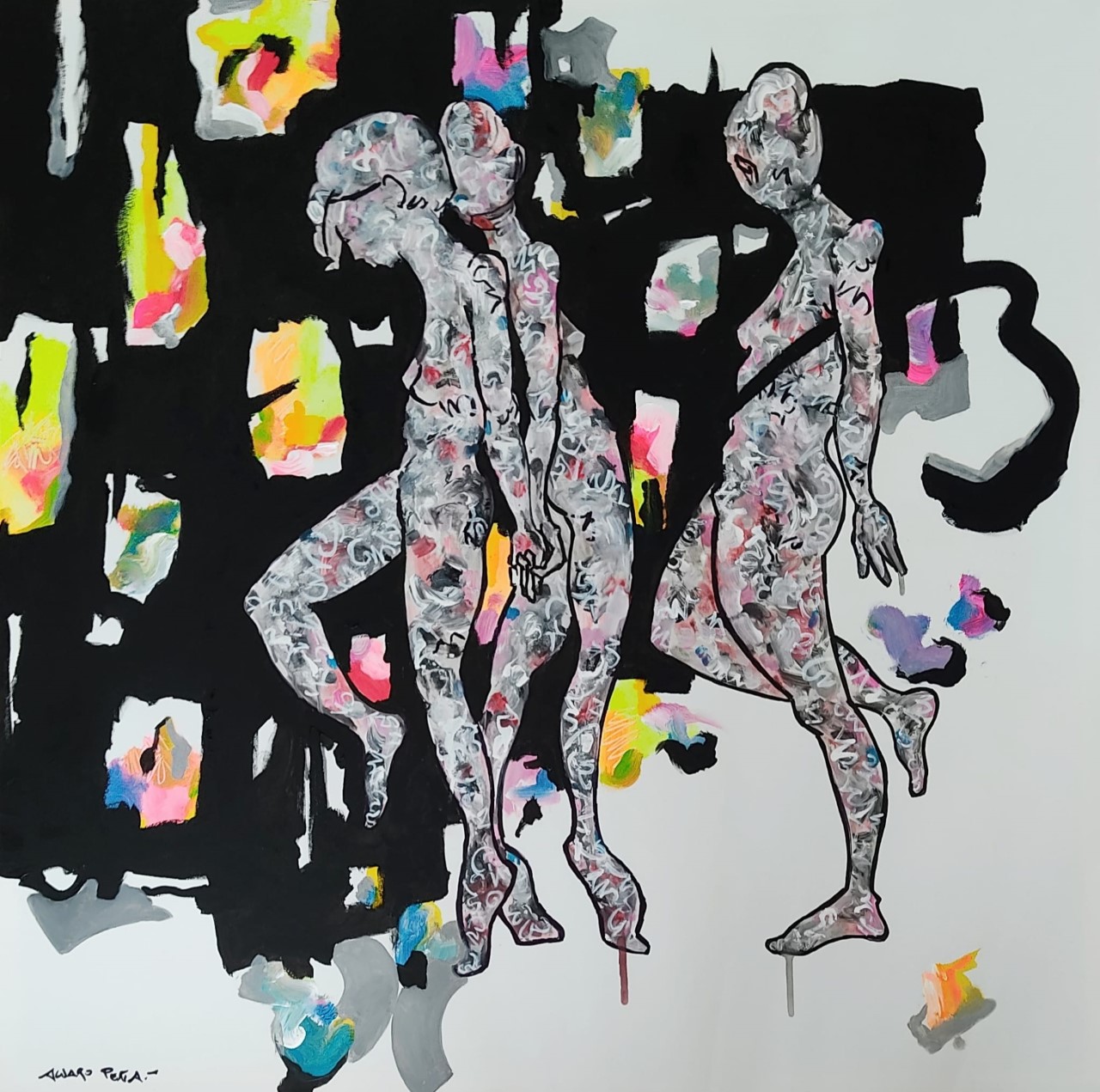 Una sensualidad que se manifiesta en sus cuadros de forma constante, mediante la permanente representación de la figura femenina, o de elementos figurativos que nos remiten al cuerpo femenino, a la mujer, en distintos estados y posiciones. A Álvaro le cuesta sustraerse a esa referencia a lo figurativo; una reminiscencia ineludible que recuerda su vinculación con la ilustración y el cómic, con sus colaboraciones en prensa, un tema compositivo del que es un buen ejemplo el cuadro Sorores Templi recientemente pintado.