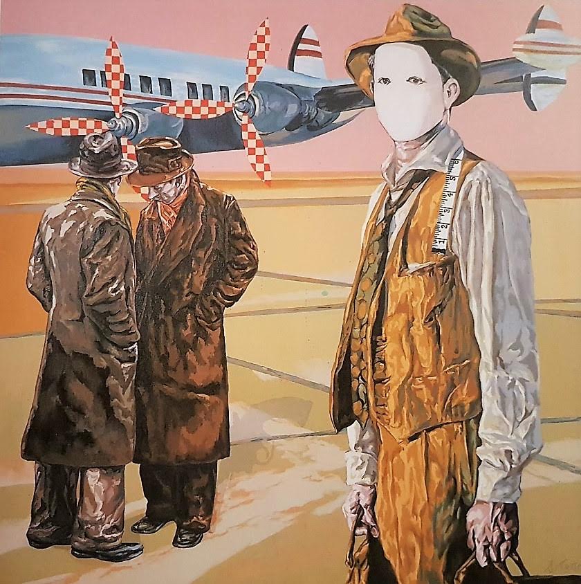 Un hombre anónimo está a punto de coger un avión. Sabemos de su anonimato porque el rostro está oculto tras una máscara blanca que solamente deja que veamos el tono verdoso de sus ojos. En la mano bolsa y maleta. Viste impecable: un pantalón recién planchado, chaleco, cubriendo una inmaculada camisa, y corbata estampada. Y remata el atuendo con un sombrero Fedora, de elegante color marrón, a juego con la vestimenta. Pero, si somos capaces de abstraernos de la inquietud que provoca su mirada, no deja de resultar extraño que adorne sus hombros con una cinta métrica propia de sastres y modistos cortadores de patrones. Un enigma. Sí, son los objetos y otros aditamentos los que determinan los misterios que nos rodean. Los objetos que, como presencias táctiles y fantasmagóricas, recorren nuestros recuerdos y marcan nuestras vidas. Los objetos que, a menudo, propician los hallazgos fortuitos -casi surreales-; poderosos activadores de la memoria y de la imaginación. Puede que, en ese viaje hacia ninguna parte, o hacia no se sabe dónde, nuestro personaje lleve ya en la maleta los objetos que se encontraron tras su muerte: unos patrones de sastrería -lo que confirma que el trabajo que desempeña este individuo anónimo sea el de un sastre; dos pasaportes -lo que ya hace dudar no solo de su identidad, sino de la posible usurpación de otras identidades o, quizá, de su capacidad para asumir identidades distintas según requiera la conveniencia del momento-; un revolver -la cosa parece volverse más interesante-; y un extraño documento "de libre circulación" por todo el territorio nacional -el asunto ya parece casi esclarecedor, sobre todo si seguimos observando la imagen representada en el cuadro-. Que perfecto disfraz para ejercer de espía: ¡sastre!; lo suficientemente cercano, casual y discreto, para moverse libre y acceder a la privacidad de cualquier hogar y ambiente, participando de todas las íntimas confidencias posibles. Mientras esperan embarcar, junto a nuestro anónimo personaje, dos ¿caballeros?, enfundados en sendos gabanes y tocados con sombreros -los rojos no usaban sombrero, anunciaba la sombrerería Brave sita en la calle Montera 6 de Madrid-, cuchichean en voz baja; sus sombras transmutadas en un amenazante revolver. Extraña situación. Enigma. Toda la escena, contenida en el cuadro, se nos parece tal que el preludio de una novela de espionaje. Una escena que es, también, el retrato de una época: la España gris, paupérrima, plena de susurros y ocultaciones en los años que median entre 1940 y 1955.