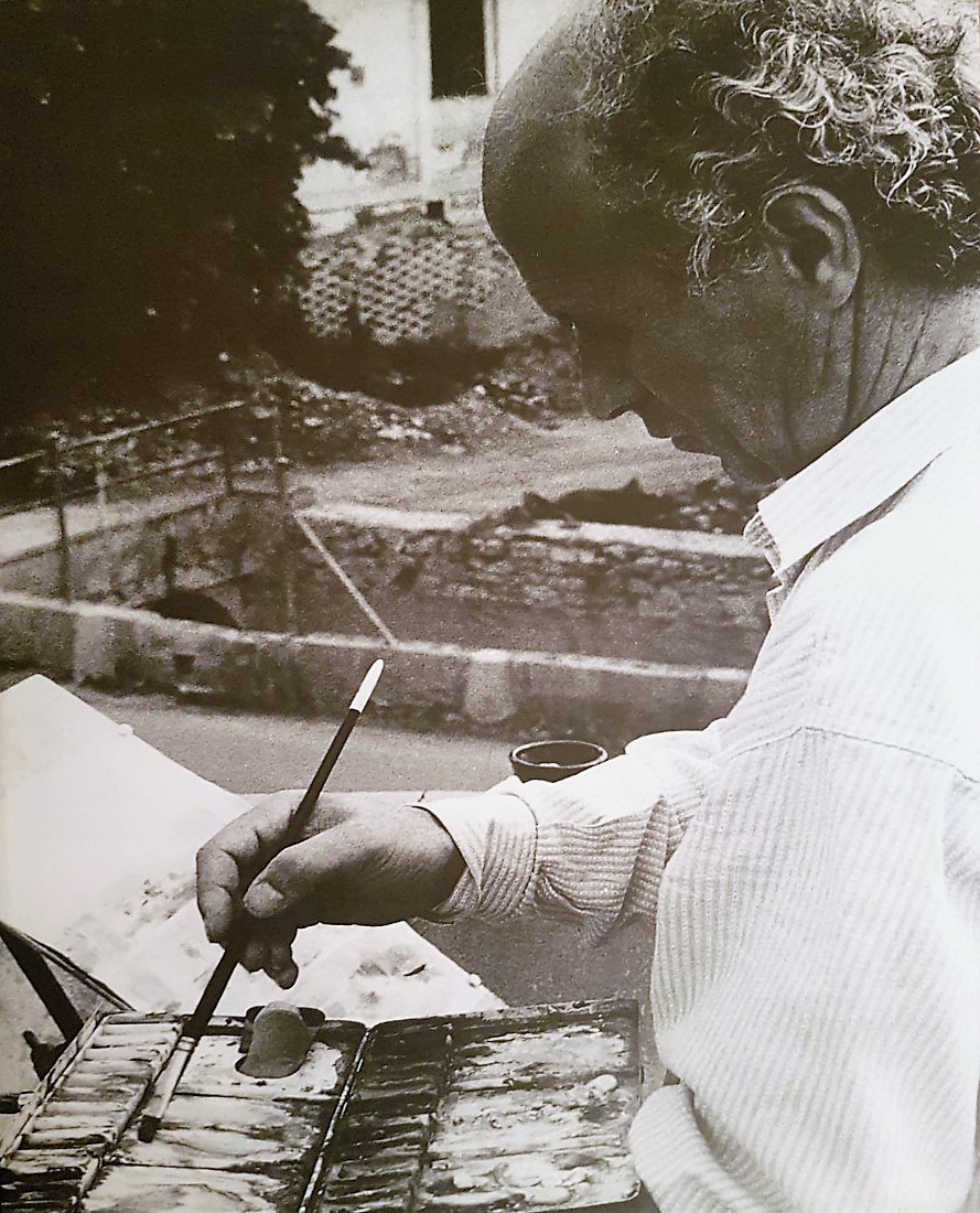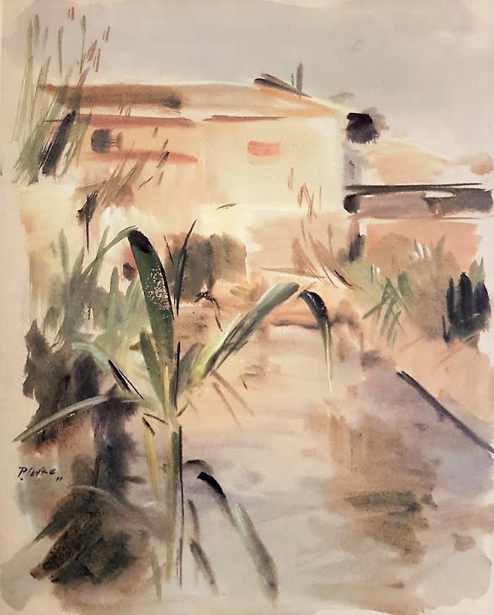 La pintura de Pedro Serna no se concibe sin tener presente la relación del pintor con la naturaleza, con lo mutable que esta resulta, con los cambios de la luz, con la densidad del aire que envuelve objetos y frutas, elementos vegetales y construcciones humanas... reflejos en el agua, sombras entre las hojas de los árboles... ¡Ah!, que idónea resulta la acuarela -pues no permite correcciones ni arrepentimientos- para recoger esos instantes fugaces. Cuántas veces saldría Serna, sobre todo en la década de los ochenta y parte de los noventa, a pintar con Ramón Gaya -excursiones, otras tantas veces recogidas por la cámara de Juan Ballester- en el paisaje murciano: La Torre de Alguazas o del Obispo, en la Huerta de Abajo; los jardines, entonces en abandono, de la casa del Marqués de Perinat, en Archena; Blanca... Y, sobre todo, acequias y brazales, ingenios para elevar agua y distribuir riegos: molinos en la Acequia Mayor, camino de La Ñora -de intensos contrastes, rojos y añiles, verdes y azules claros y luminosos-; la abandonada Máquina de Alguazas... Pinturas de paisajes cuyo objetivo, más allá del paisaje, está en la búsqueda de una pureza formal, de una pintura esencial despojada de artificio...